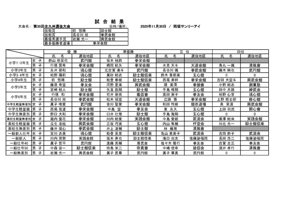 ホーム空手大会 試合結果はこちら SHARE ツイート シェア はてブ LINE Pocket 励士館主催 POINT&K.O.第35回全九州空手道選手権大会組手トーナメント日時 2025年11月30日(日)会場 岡垣サンリーアイお問合せ 川北流空手道 励士館 電話番号 0949-26-2092 POINT&K.O.第35回全九州空手道選手権大会試合結果